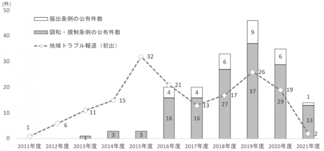 固定買取制度が導入された当時は法令上の整備が進んでおらず、社会的な諸問題が生じる要因ともなりましたが、近年は各自治体で条例やガイドラインの整備が進められ、前述の通り、令和6年4月改正の再エネ特措法関連法令でFIT/FIP認定申請要件も強化がなされています。